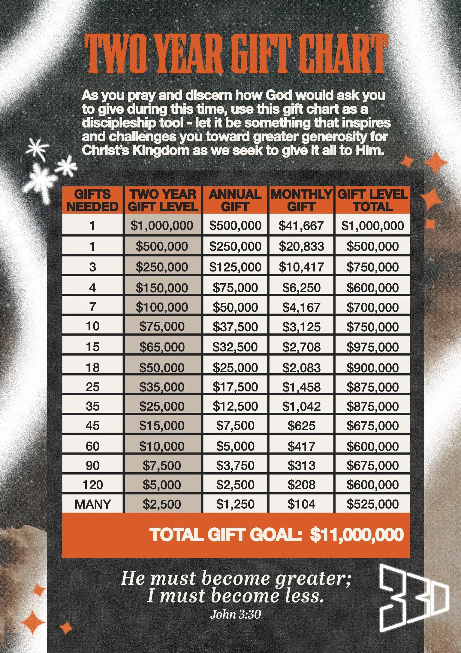 First and foremost, this journey is a call to spiritual growth. Our primary goal is 100% engagement – that every single one of us would take a personal journey with God and learn what He might have for us as it relates to generosity with our time, talents, and treasure – and greater dependence on Him. It’s about stepping out in faith and watching our courage and conviction grow as we follow God’s lead.