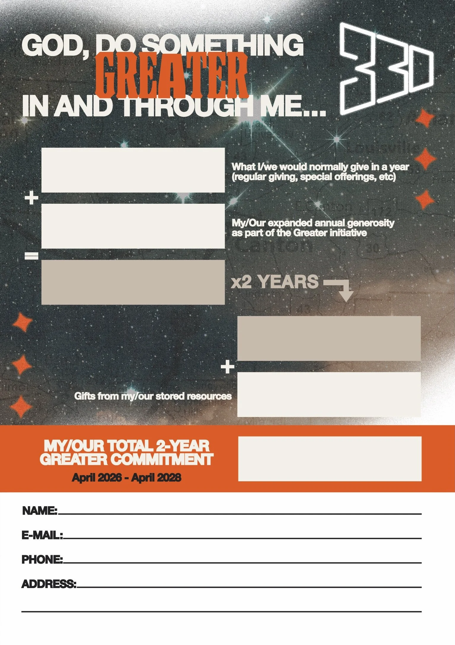 Your total two-year commitment includes your current/regular giving, your expanded Greater giving for the year, and any special gifts you may feel led to give from your stored resources.